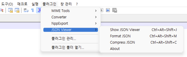 플러그인 설치를 완료하면 JSON Viewer메뉴가 나타나며 아래 이미지와 같이 Show Json Viewer,Format Json, Compress Json 가지 타입의 항목이 나타난것을 확인 할 수 있습니다.