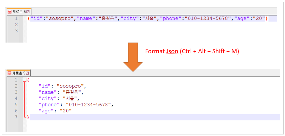 | Format Json | Ctrl + Alt + Shift + M | Json파일을 보기좋게 Tree형태로 표기합니다. |