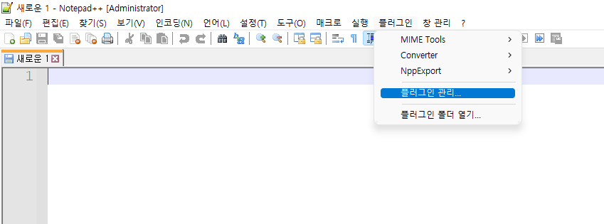 Notepad++메뉴 -> 플러그인 -> 플러그인 관리 메뉴를 선택합니다.