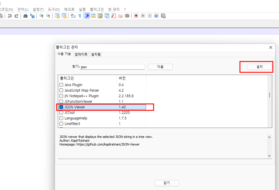 플러그인 관리 항목에 JSON Viewer항목을 선택 후 설치를 합니다.