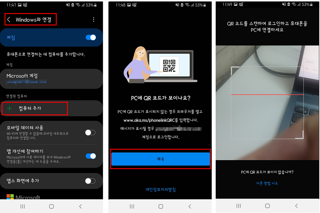 Winows와 연결 -> 컴퓨터추가 -> PC에 QR코드가 있을경우 계속 아니면 www.aka.ms/phonelinkQRC 를 입력하면 QR화면을 띄어줌 -> QR코드 스캔