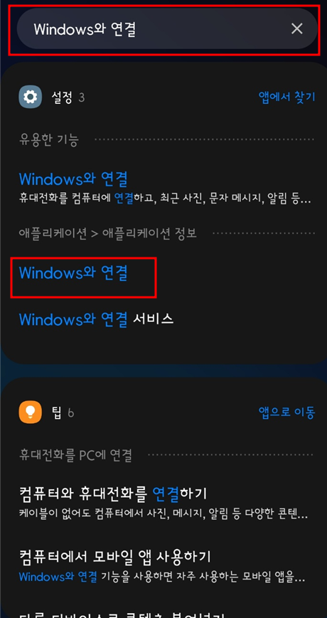 휴대폰에 내장된 QR코드 스캔하는 부분으로 처리하지 지원하는 앱이 없음니다. 하면서 처리가 되지 않았습니다. Windows와 연결메뉴에 들어가서 QR스캔을 하면 됩니다. 먼저 검색창에 "Windows와 연결" 로 검색하여 해당메뉴를 선택합니다.