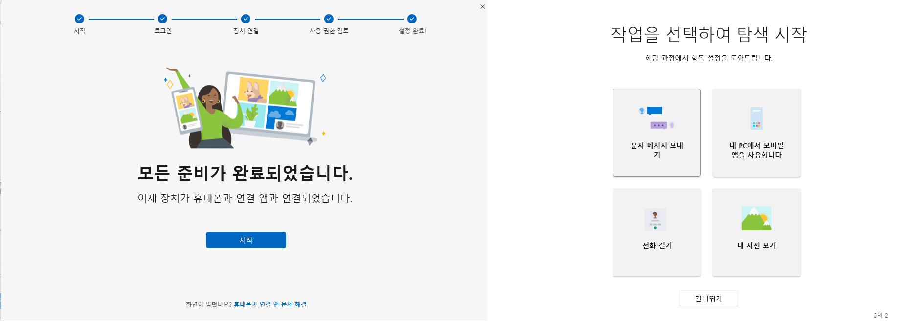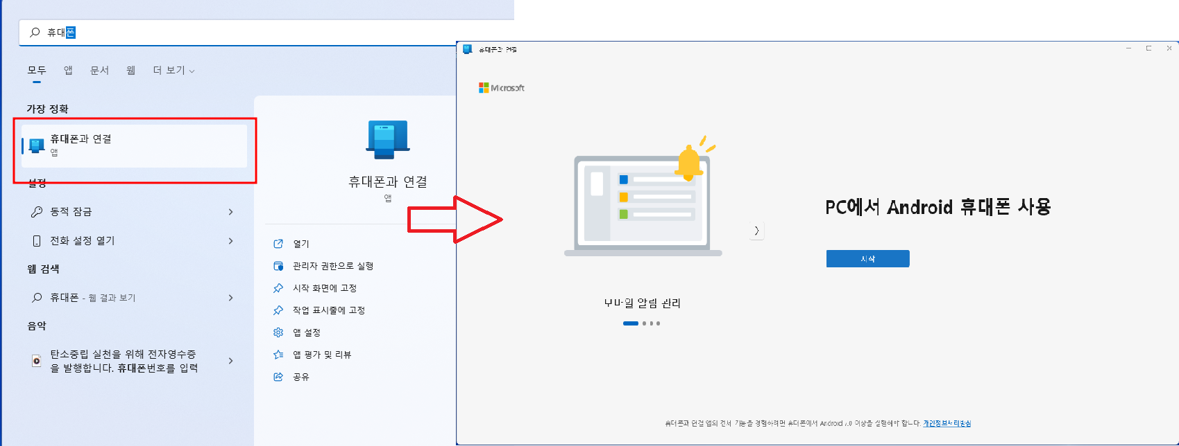 2. 휴대폰과 연결 항목을 실행하면 아래와 같이 PC에서 Android 휴대폰사용 화면이 나타납니다.
