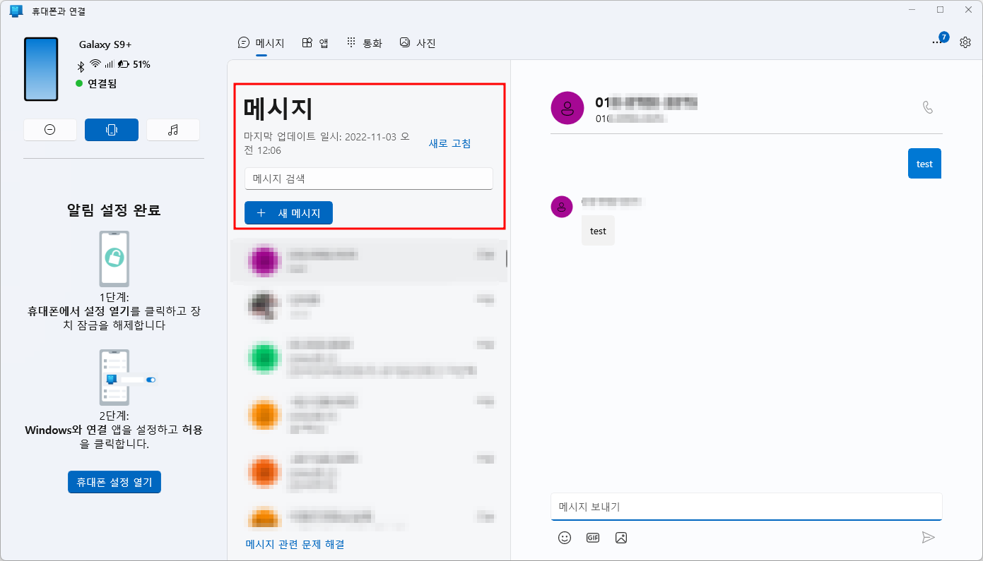 휴대폰과 연결되면 전송된 메세지 이력 확인이 가능하며 새 메세지 버튼을 클릭하여 메세지 전송이 가능합니다.
