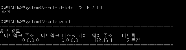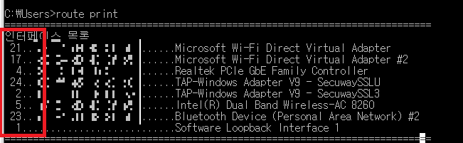 route print명령을 실행하면 현재 라우팅테이블 정보를 확인할수 있습니다.