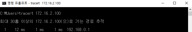 tracert 명령으로 어느 게이트웨이로 나가는지 확인이 가능합니다. 아래명령으로 해보면 게이트웨이 192.168.0.1의 경로로 경로가 나가는건이 확인됩니다. 이렇게되면 연결이 되지 않습니다. 이때 라우팅명령으로 연결을 추가해줍니다.