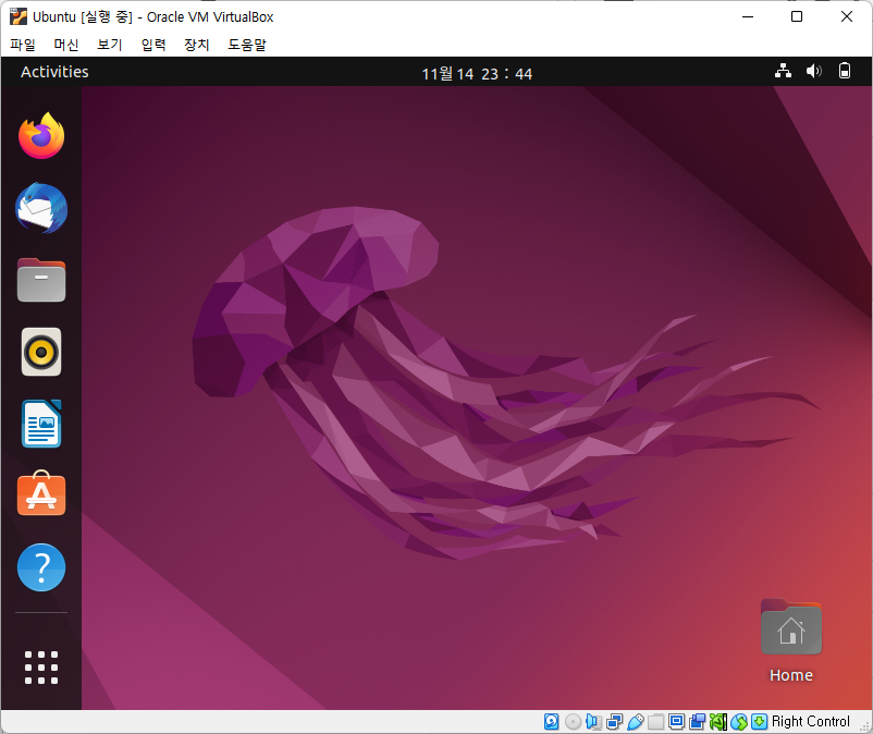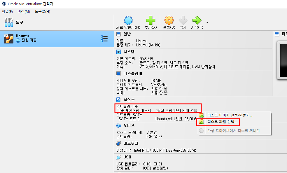 버추얼박스의 저장소 항목에 컨트롤러:IDE항목을 마우스 우클릭하면 디스크파일 선택 메뉴가 나타나고 다운받은 우분투iso파일(ubuntu-22.04.1-desktop-amd64)을 선택합니다.