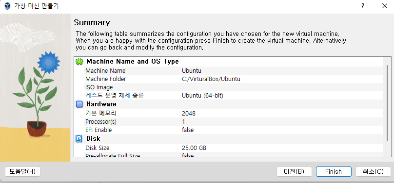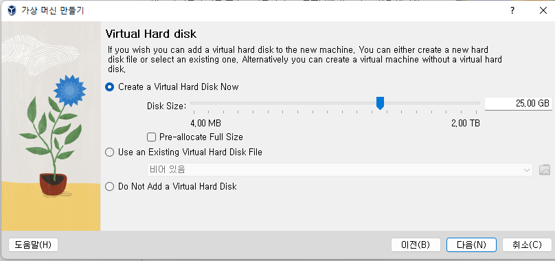 기본메모리 2G, 프로세스는 2개, 저장용량은 25G로 설정합니다. 프로세스를 1개로 할 경우 kernel panic not syncing 오류가 발생 할 수 있으니 프로세스 2개로 하여 설치 바랍니다.