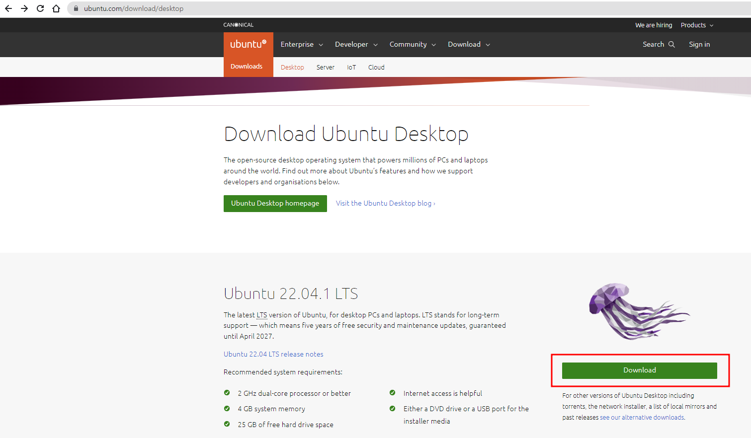 우분투 OS를 설치하기 위해서는 iso이미지파일다운 받아야 합니다. https://ubuntu.com/download/desktop 사이트에 접속해서 우분투 이미지를 다운 받습니다.