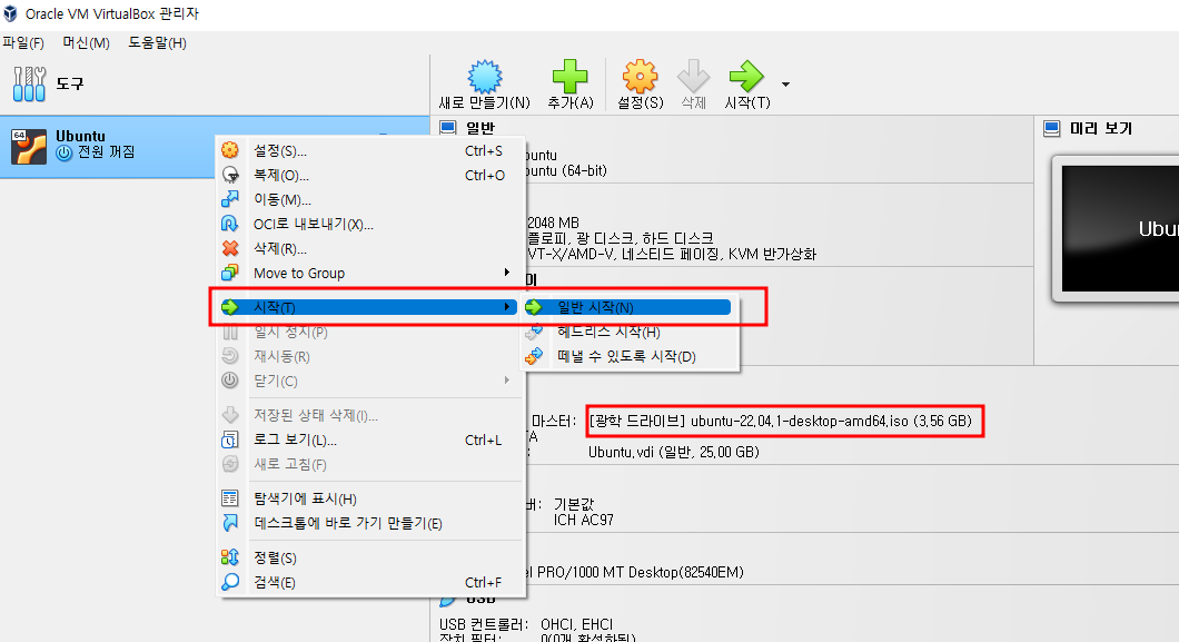 Ubuntu항목 선택 후 시작 -> 일반시작 메뉴를 선택해서 설치를 진행합니다.