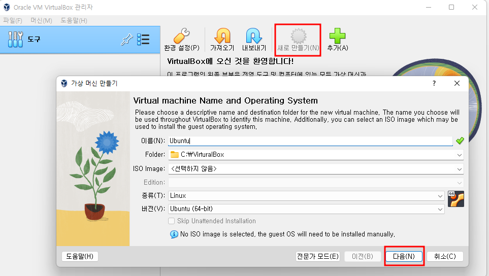 기본값으로 설치해보겠습니다. 새로만들기를 선택 하고 종료(T) 는 Linux 버전은 Ubuntu로 선택합니다.