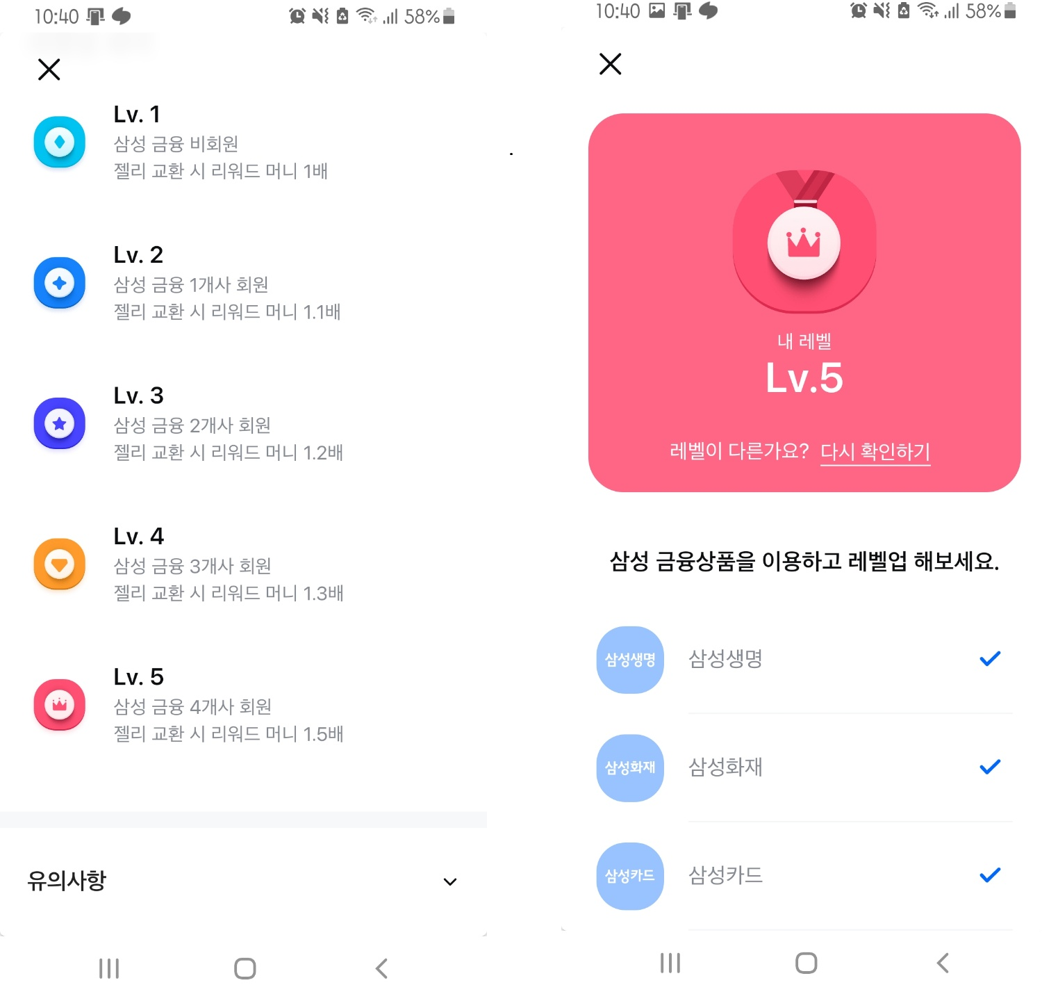 저 같은 경우는 삼성생명,화재,카드 모두 사용하고 있어 Lv5등급으로 적립시 1.5배 적립받았습니다. 삼성제품을 많이 사용하면 적립도 많이 해주는 형태입니다.