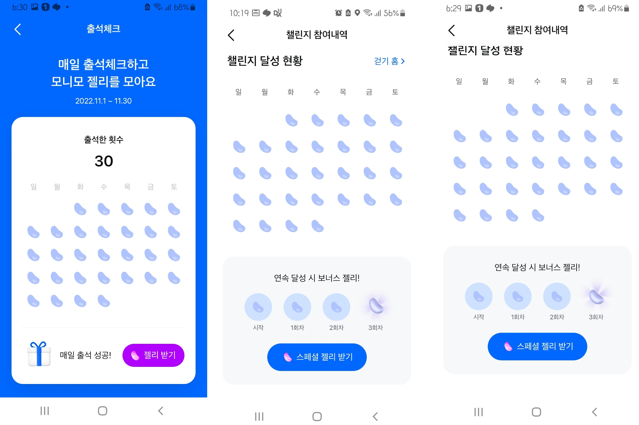 스페셜 젤리를 받으려면 매일 빠짐없이 해야되는데 하루 10분정도 아침에 한번 저녁에 5000보이상 걷고 난 다음 두번정도 만 잊지 않고 해주면 한달에 만원 정도 생기니 수익이 쏠쏠합니다.