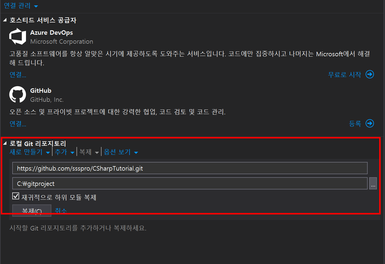 아래이미지와 같이 로컬 Git리포지토리라는 항목이 나오며 위쪽에는 Clone하고싶은 Git서버주소를 기입하고, 아래는 로컬디렉토리를 기입 후 복제 버튼을 클릭합니다.