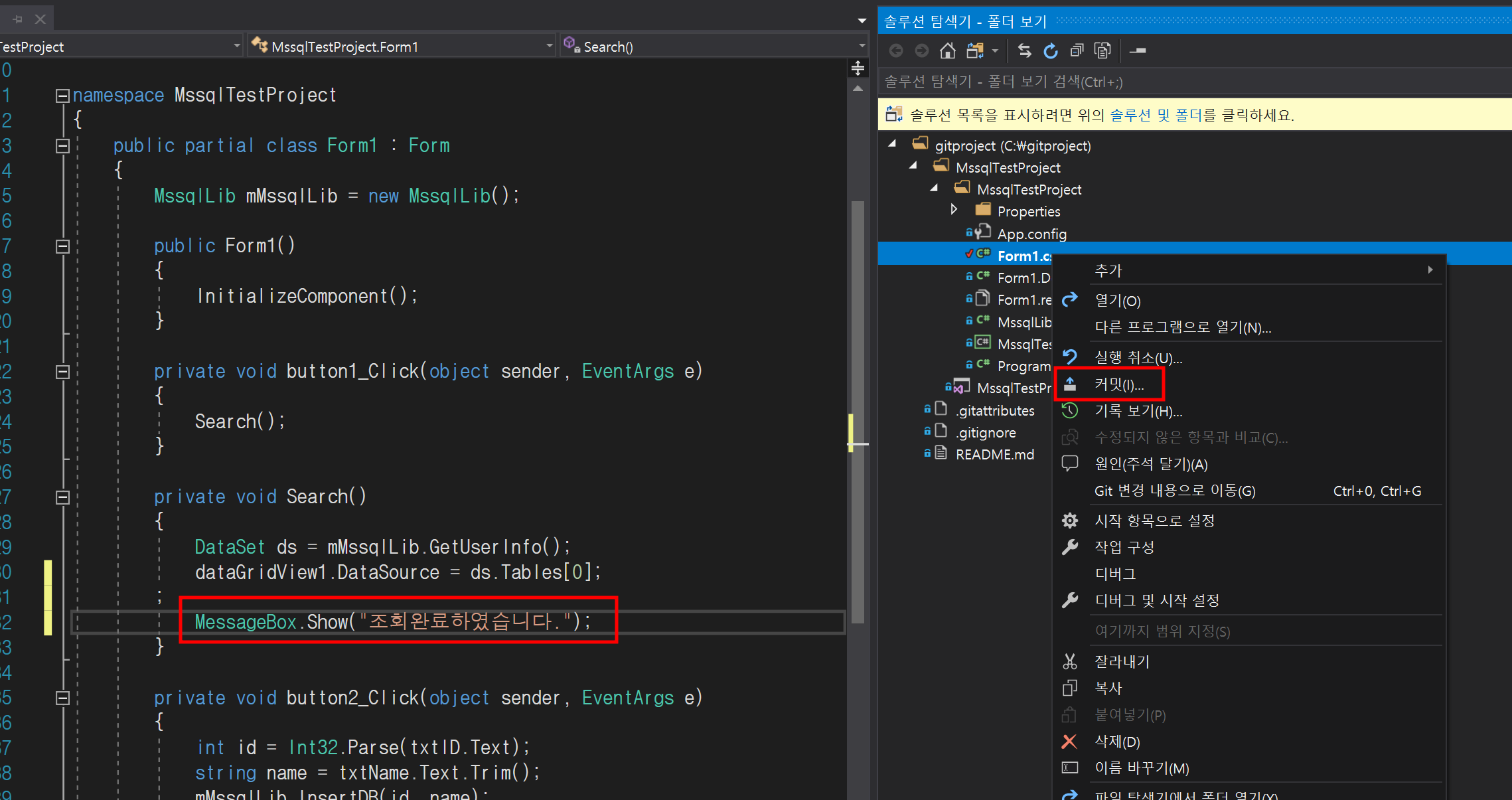 먼저 소스코드를 수정 후 Commit을 합니다. 소스를 Commit하면 로컬저장소에만 Commit된 상태이므로 서버저장소로 Push하여 올려야합니다.