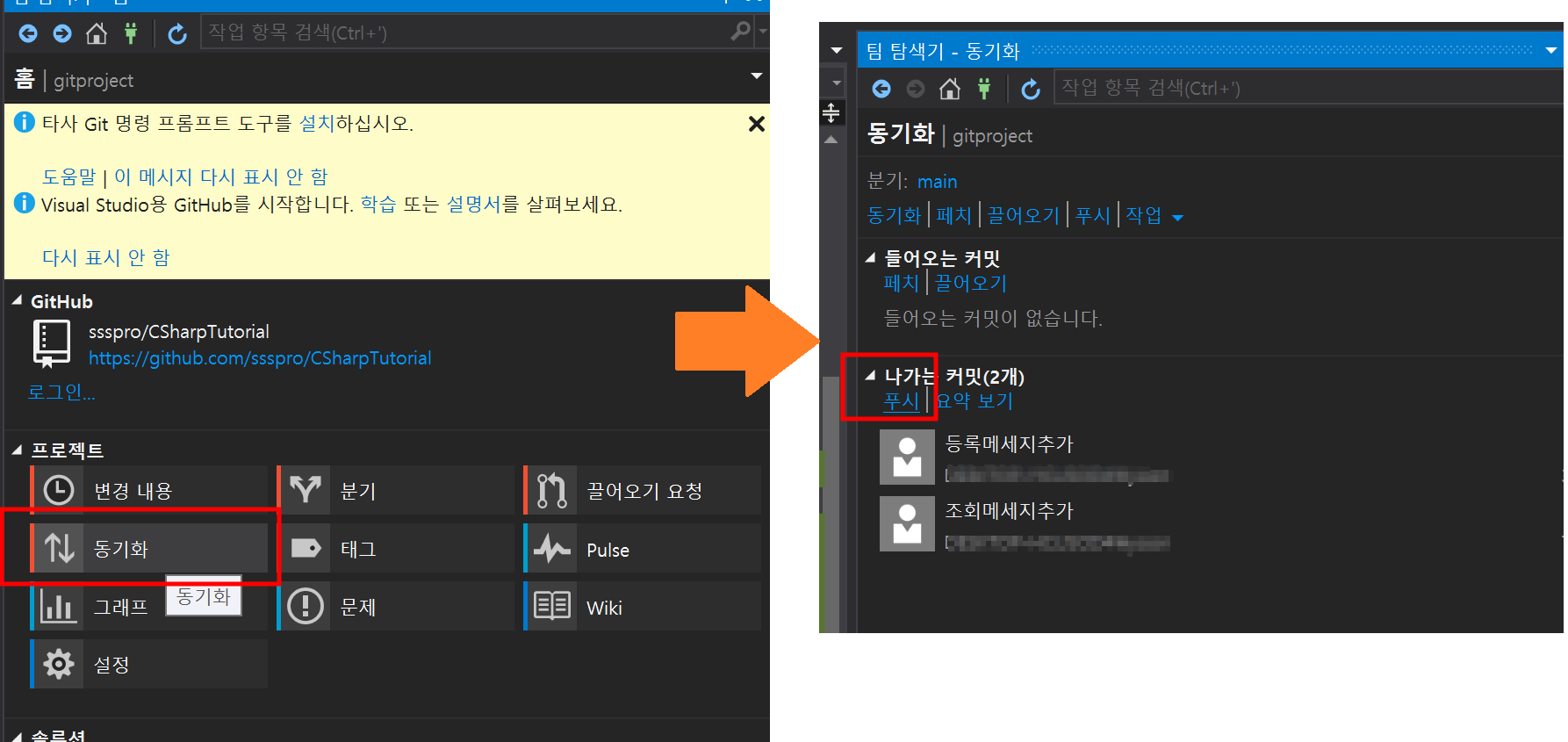 메뉴 -> 도구 -> 확장 및 업데이트 -> GitHub Extension for Visual Studio를 검색하여 설치합니다.
