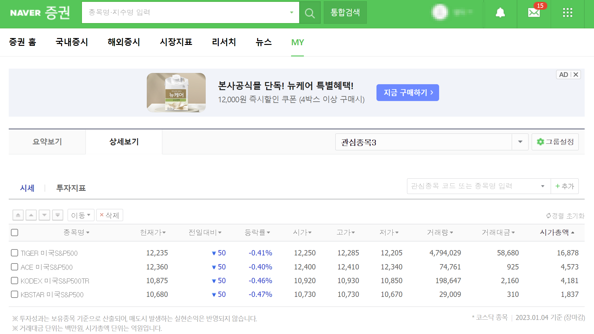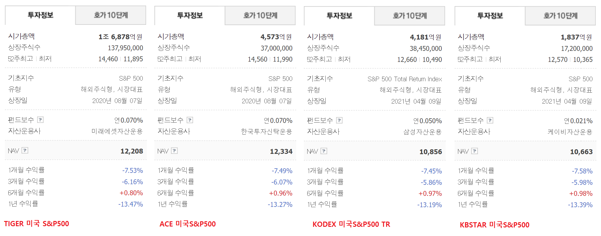 국내증권사에서 미국S&P주식에 투자하는 종목관련 수수료에 대해 비교해보겠습니다. 네이버증권에서 미국S&P500항목을 투자하고 있는 항목으로 시가총액기준으로 Tiger 미국S&P500, ACE, KODEX, KBSTAR 4가지 항목에 대해 살펴보겠습니다.