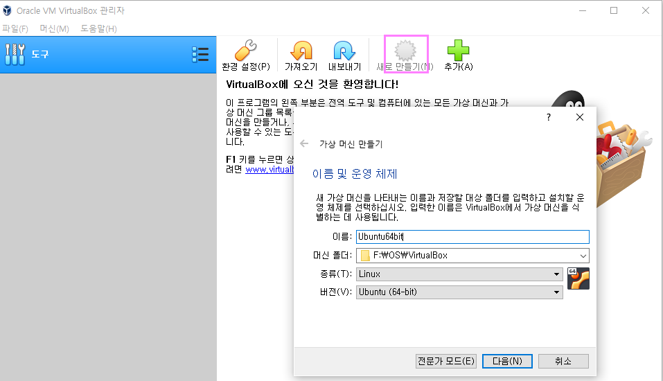 먼저 새로만들기버튼을 클릭합니다. 종류에 Linux를 선택하고 버전은 Ubuntu(64-bit)항목을 선택하여 설치하도록 하겠습니다.