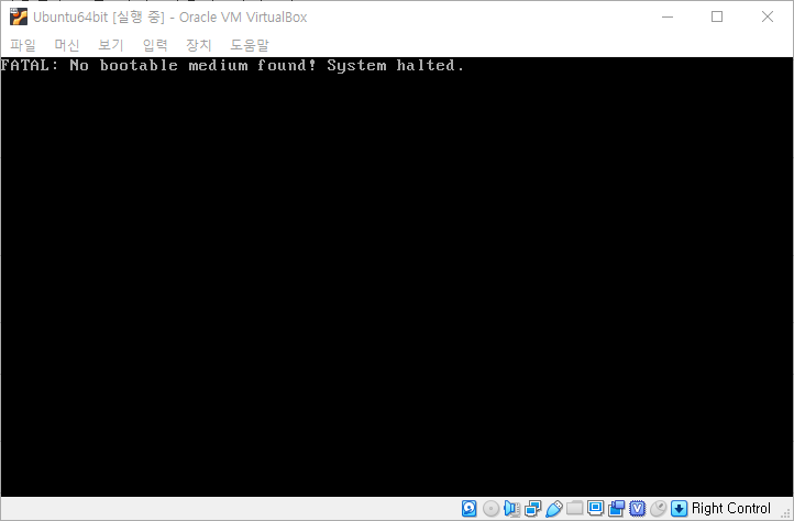 이제 OS항목을 선택하고 실행하며 아래와 같이 No Bootable medium found메세지가 나타납니다.