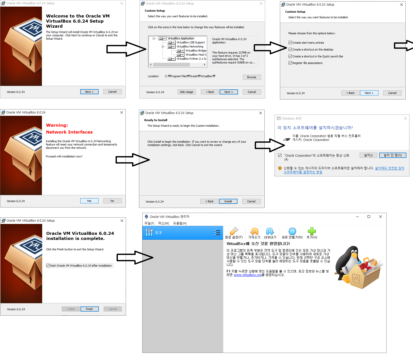 다운받은 VirtualBox-6.0.24-139119-Win 파일을 설치합니다. 아래와 같은 순서로 설치를 하면됩니다.