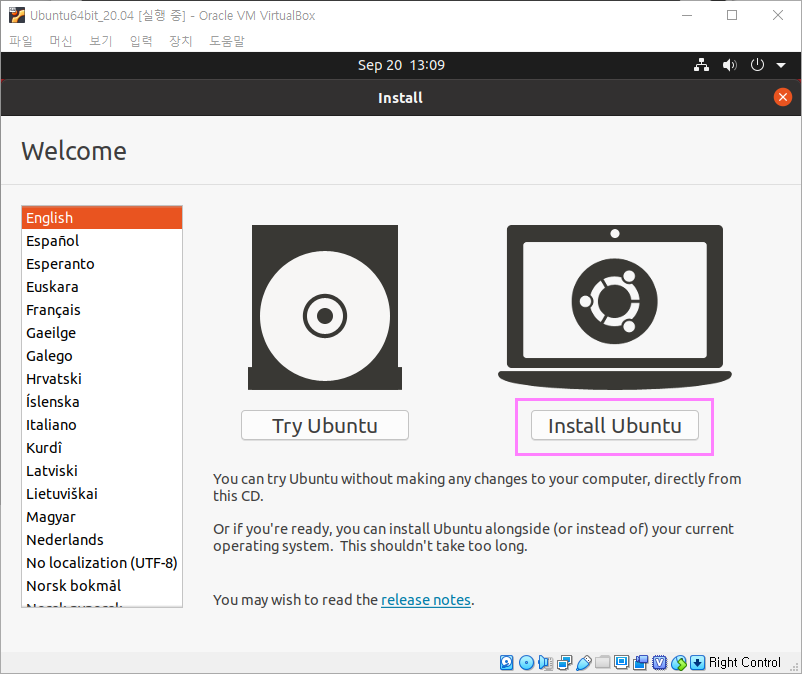 이제 다시우분트항목을 실행하면 우분투리눅스 설치화면이 나타나며 OS설치를하면됩니다.