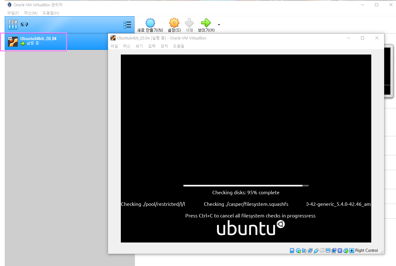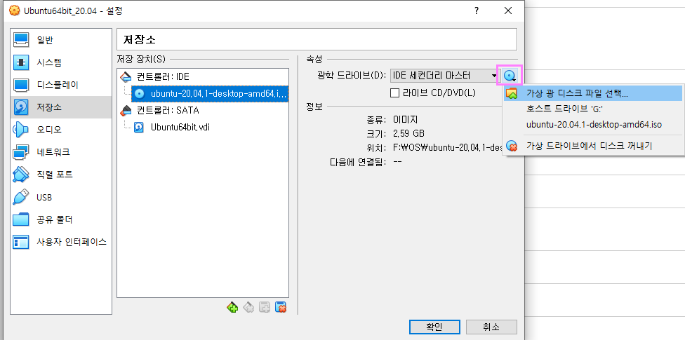 이제 버추얼박스를 다시 실행한다운 저장소에 컨트롤러IDE항목에 CD모양을 클릭하면 가상 광디스크 파일 선택메뉴가 나타나며 여기에 ubuntu-20.04.1-desktop-amd64.iso 파일은 선택합니다. 컨트롤 IDE항목보면 ubuntu-20.04.iso파일이 선택된것을 알수 있습니다. 이제 다시 재부팅하여 설치되는부분을 확인해보겠습니다.