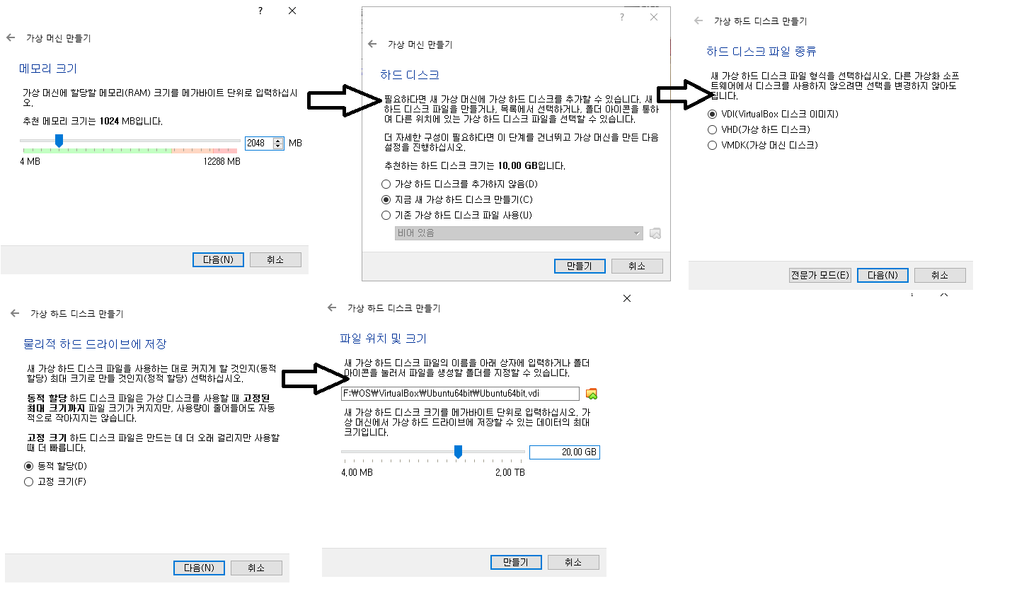 우분투20.04버전의 설치용량이 2.8G정도가 되어 하드디스트는 20G동적할당으로 설정하고, 메모리 크기는 2G설정하여 설치해보록 하겠습니다. 하드디스크 파일종류에 대하여 잠시설명드리면 가상하드디스트 파일형태이며 아래와 같습니다.