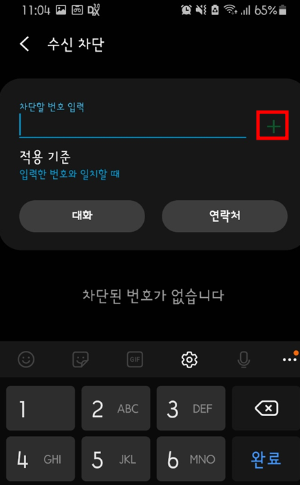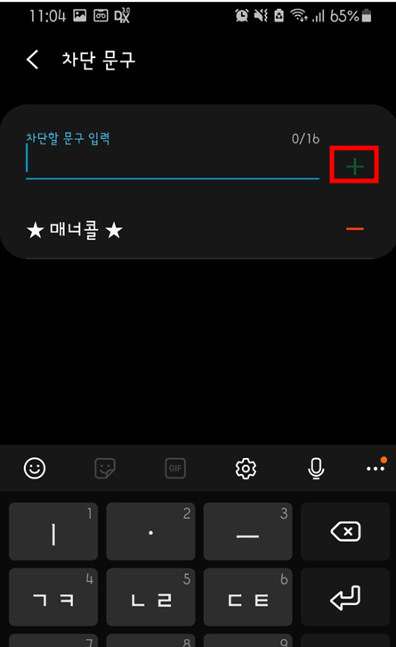 차단문구 : 특정문구를 지정해서 해당문자 메세지를 차단시킬 수 있습니다. ★ 매너콜 ★ 이라는 문자가 들어오는 경우 차단을 하고 싶을때는 아래와 같이 차단문구 입력란에 차단문구를 입력 후 + 버튼을 클릭합니다.