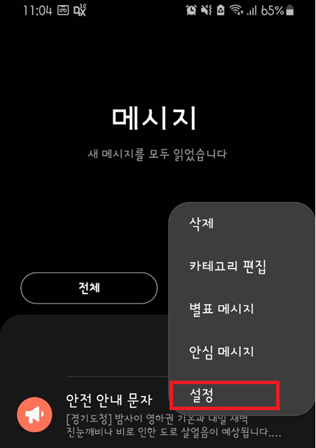 1. 메세지 -> 설정메뉴를 선택