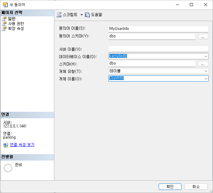 동의어 이름을 입력하고 연결하고 싶은 서버이름, 데이터베이스명, 개체유형(테이블/뷰/저장프로시저/함수)과 개체이름을 선택 후 확인을 클릭합니다. 로컬데이터베이스를 연결 할 경우에는 서버이름에 값을 입력하지 않고 진행하면됩니다.