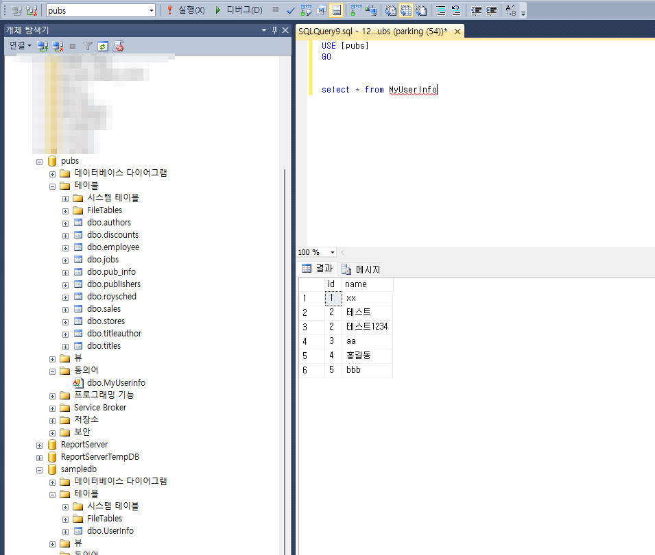 동의어(시노님)이 생성되면 select * from MyUserInfo를 입력하면 실제 pubs에 있는 테이블처럼 동작하는 부분을 확인 할 수 있습니다.