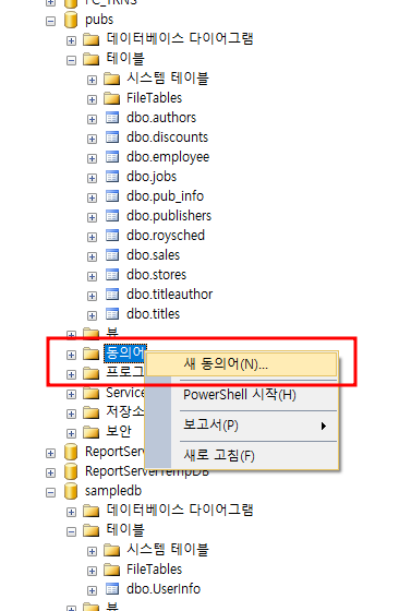 pubs의 데이터베이스에서 sampledb의 UserInfo테이블에 동의어를 생성해보도록 하겠습니다. 동의어 메뉴 -> 새 동의어를 항목을 선택합니다.