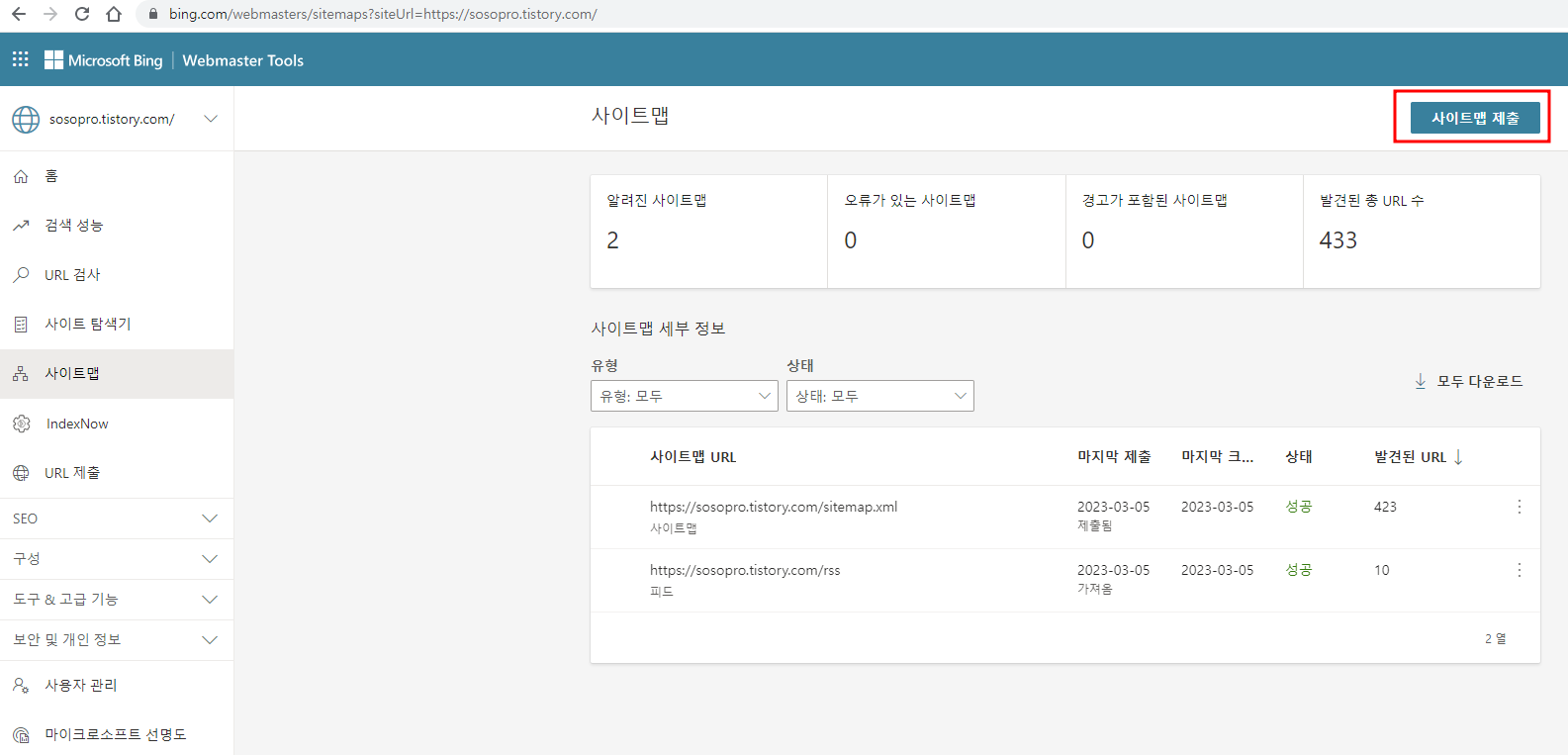구글서치에 등록된 사이트맵 정보를 그대로 가져오나 혹시나 가져오지 않을경우에는 오른쪽 상단의 사이트맵 제출버튼을 클릭해서 sitemap.xml , rss을 추가 등록합니다.