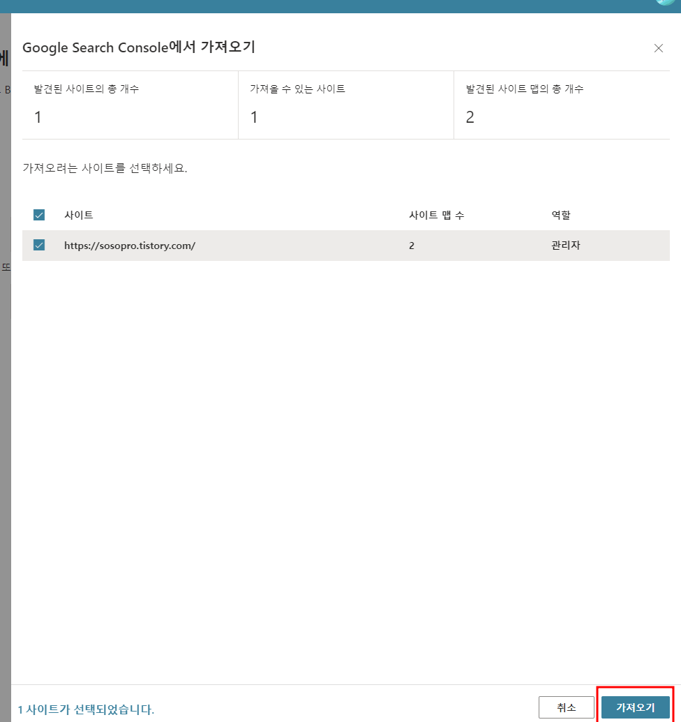 구글 계정으로 로그인할 경우 Goole Search Console이 이미 인증된 경우에는 해당정보를 가져오면됩니다. 티스토리 블로그의 플러그인에 구글서치 콘솔에서 쉽게 등록 할 수있기 때문에 구글 정보를 가져오겠습니다.