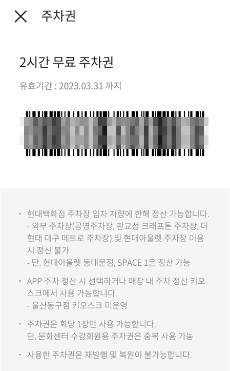 백화점내에 있는 키오스크에서 주차요금 정산시 2시간 무료주차권 바코드를 터치하면 2시간 할인 처리가 됩니다. 쿠폰은 회당 1장만 사용 가능하고 2장씩 지원해주고있습니다.