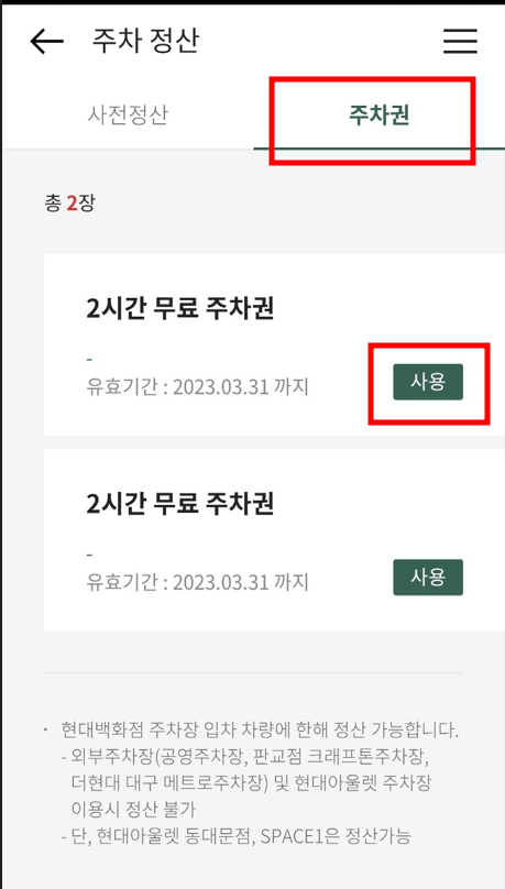 3. 주차정산 항목에서 2시간 무료주차권 선택