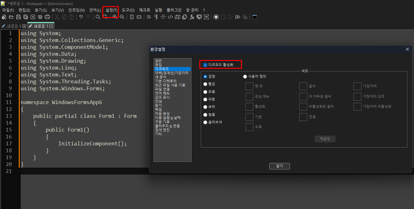 노트패드에서 다크모드를 활성화 하는 방법입니다.