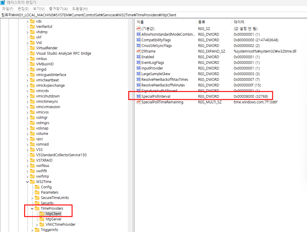 컴퓨터\\HKEY_LOCAL_MACHINE\\SYSTEM\\CurrentControlSet\\Services\\W32Time\\TimeProviders\\NtpClient 항목중에 SpecialPollInterval값을 변경하면 됩니다. PC환경마다 해당값이 약간 차이가 있어 보이며 확인해보니 32768(초)로 동기화 주기가 되어있습니다.