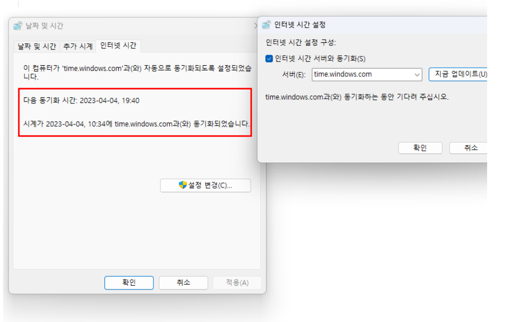 인터넷 시간 항목 -> 설정 변경 항목클릭 하면 인터넷 시간설정 화면이 나타나고 인터넷 시간 서버와 동기화를 클릭하면 해당서버와 자동으로 시간을 맞쳐 줍니다. 기본값을 time.windows.com입니다. 지금 업데이트 버튼을 클릭하면 동기화가 되는 부분을 확인 할 수 있습니다. 이때 다음 동기화 시간을 보면 9시정도 후에 되는 부분을 확인 할 수 있습니다.