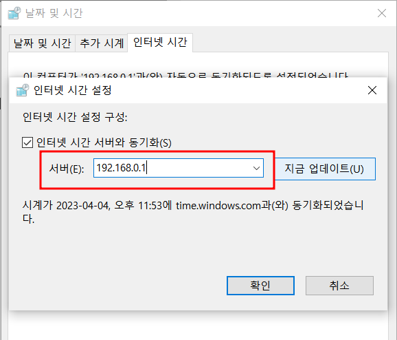 클라이언트 PC는 NTP서버설정 부분에 NTP서버로 설정한 PC의 IP주소를 입력하면됩니다.
