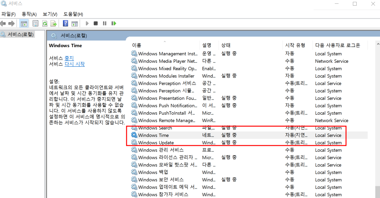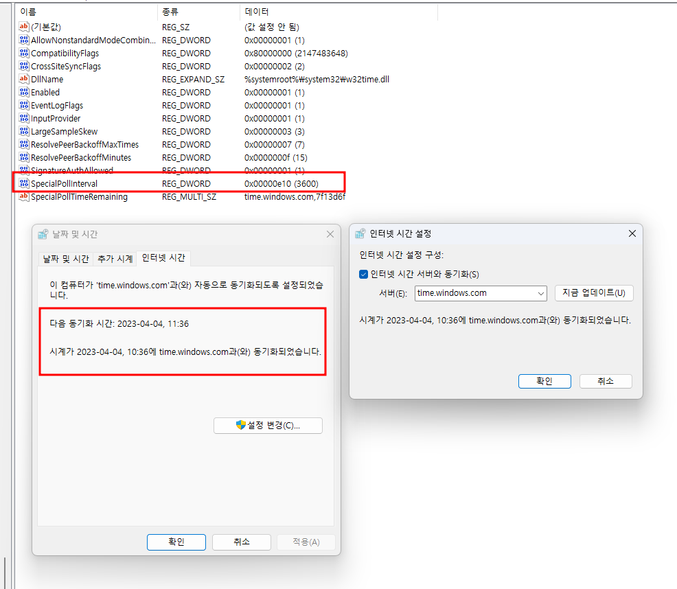 1시간 단위로 변경하기 위해서는 해당값을 3600(초)로 설정하면 값이 변경되고 해당시간으로 주기로 동기화 되는 부분을 확인 할 수 있습니다. 레지스트리값 설정 변경 후 서비스의 Windows Time 서비스를 재시작 후 다음 동기화 시간을 확인해보면 정확히 1시간 뒤로 변경이 되어있는 부분을 확인 할 수 있습니다.