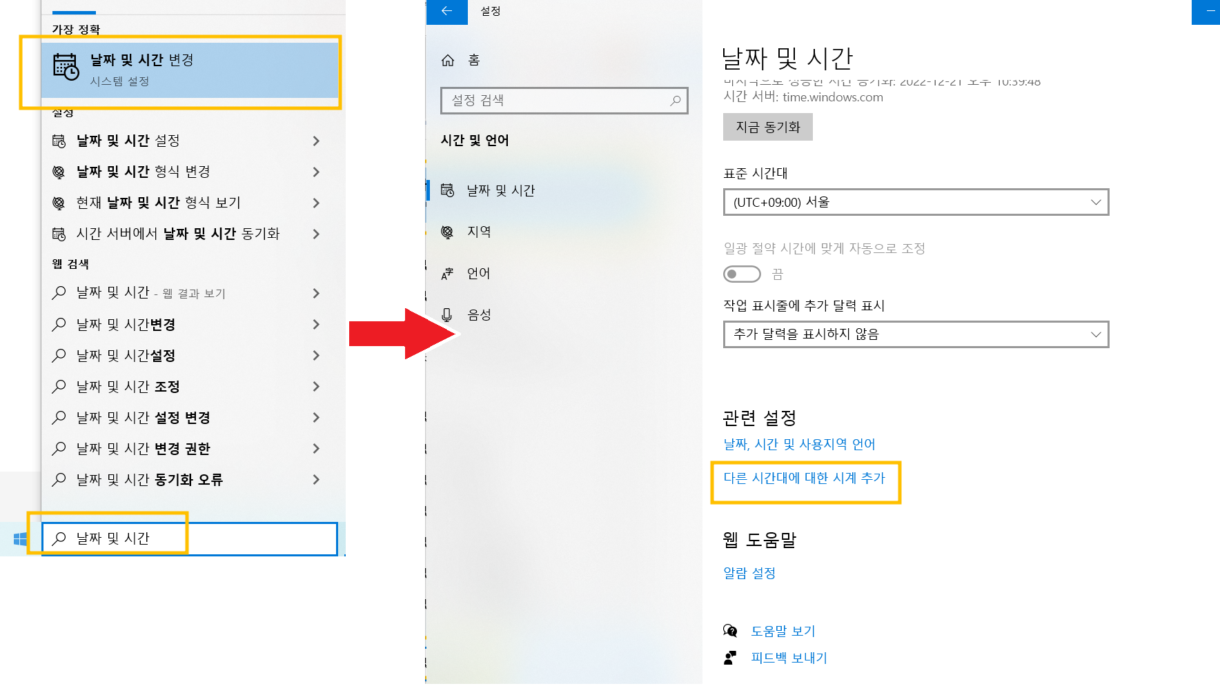 날짜 및 시간 변경 선택 하면 설정창이 나타다고 다른 시간대에 대한 시계 추가 항목을 클릭합니다.