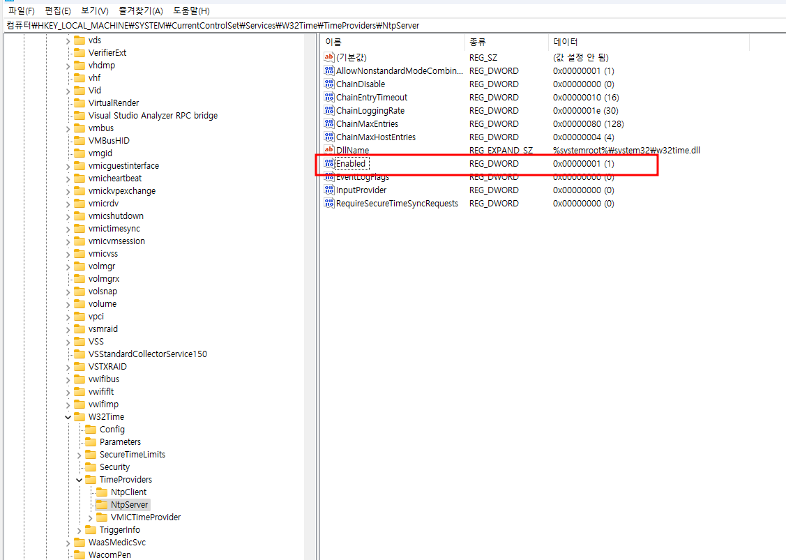 컴퓨터\\HKEY_LOCAL_MACHINE\\SYSTEM\\CurrentControlSet\\Services\\W32Time\\TimeProviders\\NtpServer의 Enabled값을 1로 변경하면됩니다. 변경 후 에는 서비스에서 Window Time 서비스를 재시작하면 NTP서버가 활성화 됩니다.