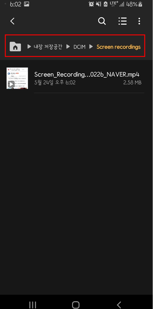 녹화된 영상은 내 저장공간 / DCIM / Screen recordings에 녹화파일이 기본 저장되니 나중에 관련 파일 찾고 싶을때는 해당폴더에서 녹화파일을 찾아서 보면됩니다.