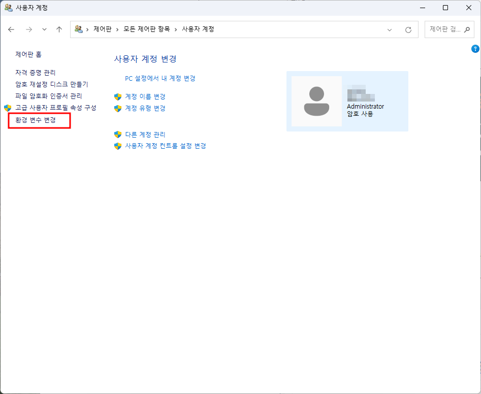 2. 왼쪽 메뉴의 환경변수 변경을 선택합니다.