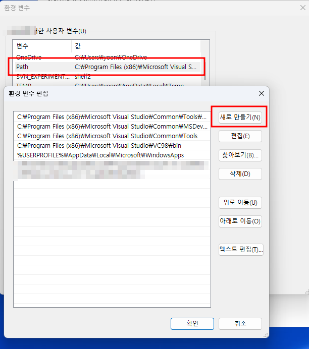 Path항목을 더블클릭하고 새로 만들기 버튼을 클릭하여 환경변수를 추가, 편집, 삭제를 할 수 있습니다.