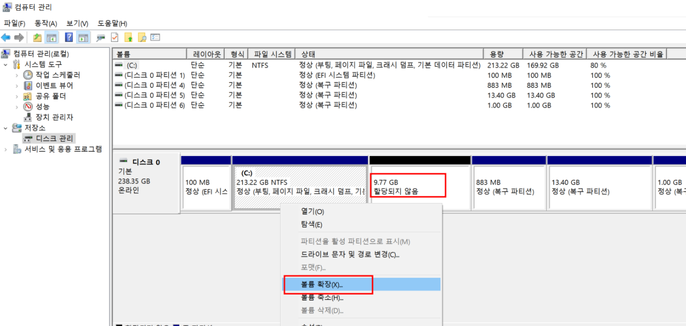 최초 D드라이브에 할당된 10G의 데이터가 C드라이브로 확장된 부분을 확인 할 수 있습니다. 디스크 부족한 경우 대부분 외장하드를 두어서 해결하면되나 간혹 초기에 C드라이브 용량은 낮게해서 파티션을 나눌 경우 C드라이브 용량이 부족하여 포멧을 생각하는 경우가 있는데 볼륨을 확장하는 방법을 이용하면 포멧을 하지 않고 부족한 C드라이브의 용량을 확보 할 수 있습니다.