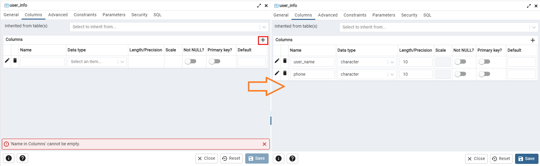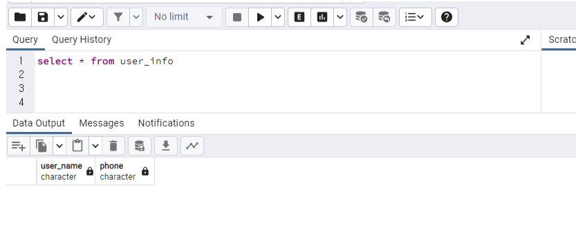 user_info테이블을 생성 후 user_nanme, phone라는 필드를 추가해보겠습니다. Date Type을 보니 요. 문자열을 하기 위해 charater형을 선택하여 생성합니다.