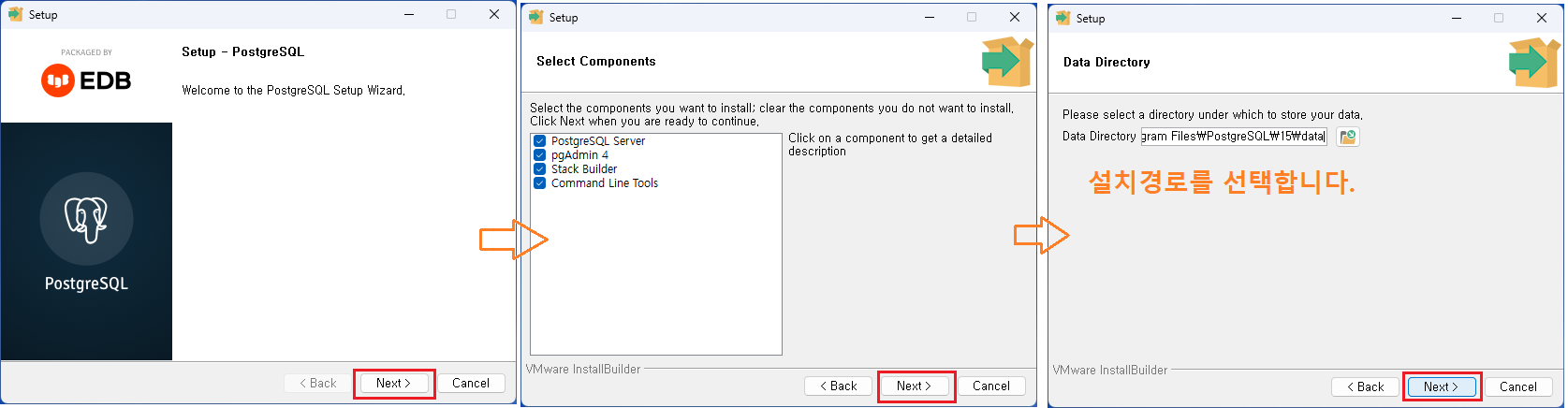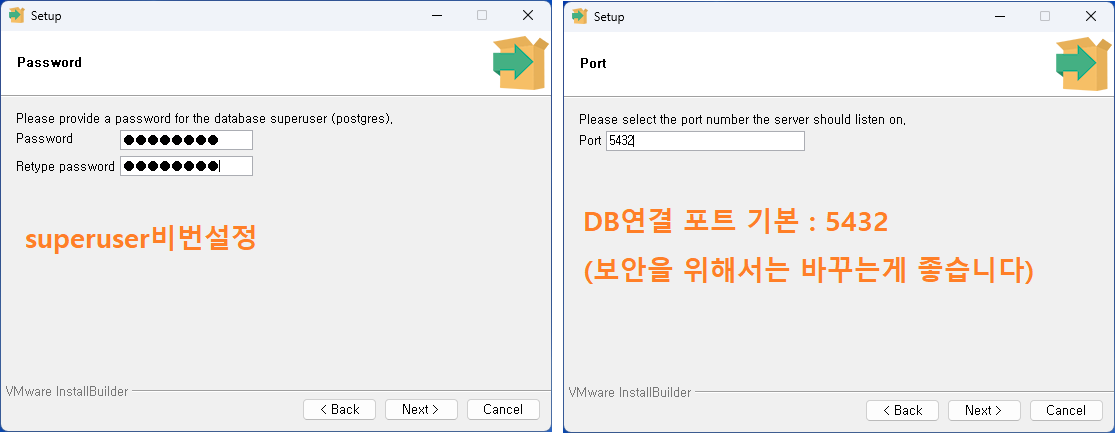 다운받은 설치파일(postgresql-15.3-1-windows-x64.exe)로 설치합니다. 15.31버전으로 설치하겠습니다. 기본적으로 Next로 하여 설치하면 되고 패스워드 입력부분을 입력하고, Port부분은 서비스를 하기위한 DB포트값을 지정합니다. 기본은 5432포트이나 알려져 있는 포트이다 보니 보안을 위해서는 다른 포트로 바꿔서 사용하는게 좋습니다.