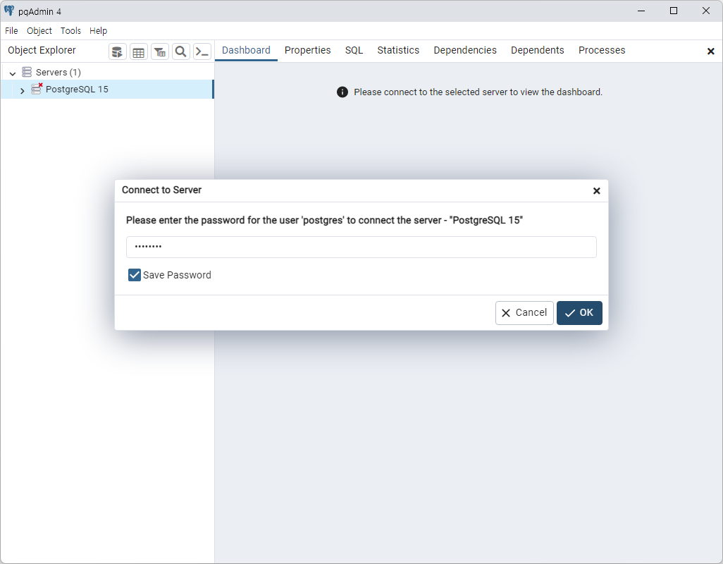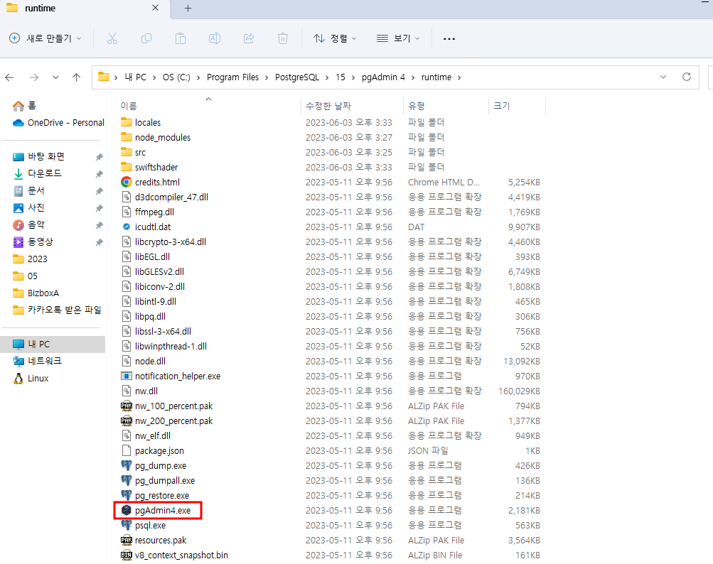 pgAdmin4.exe경로는 "C:\Program Files\PostgreSQL\15\pgAdmin 4\runtime" 하위 폴더에 있습니다.